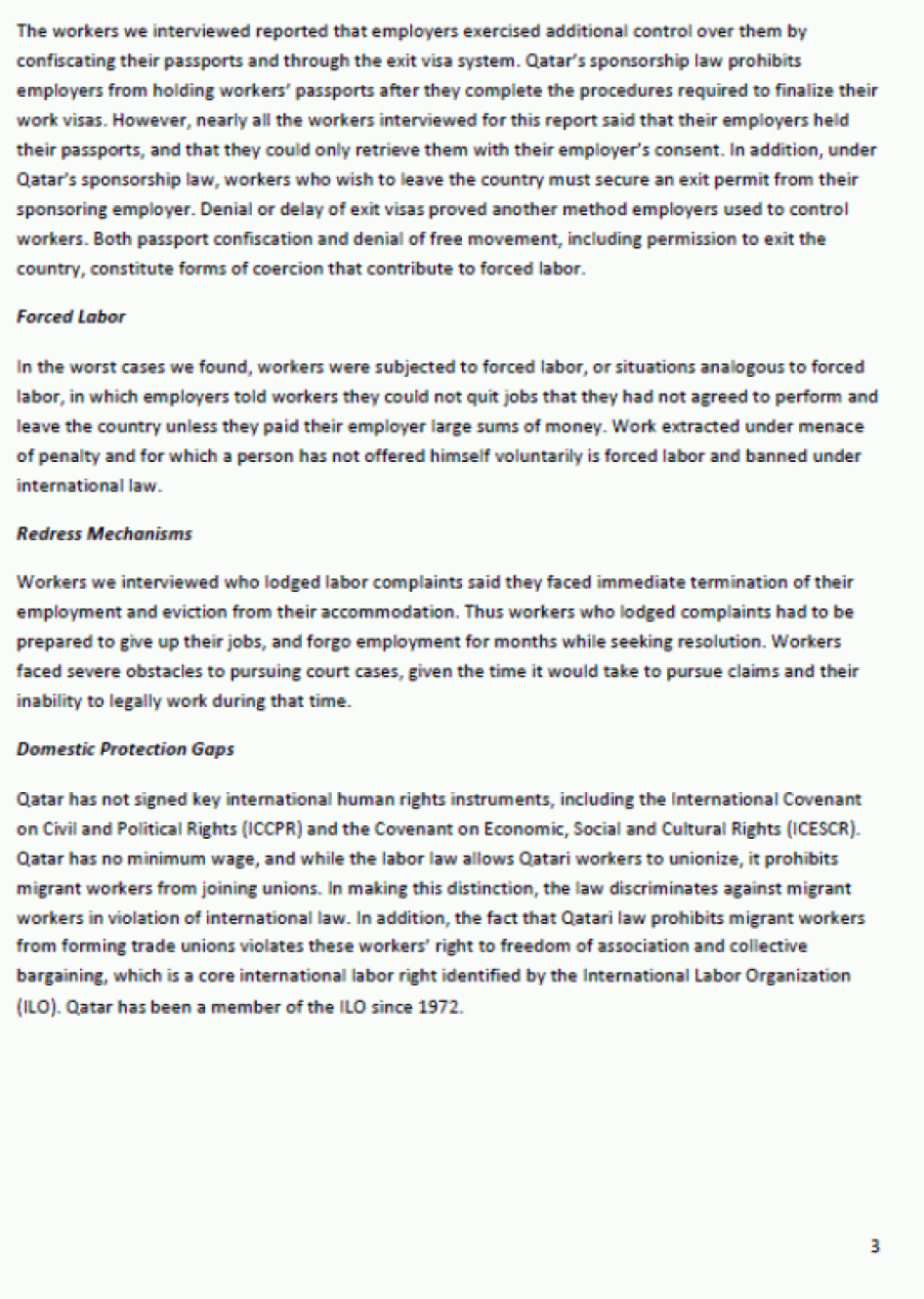 إلا أن القوانين القطرية تحرم عماء البناء من حق أساسي للعمال، هو حرية تكوين الجمعيات وحق المفاوضة الجماعية، مما يعني استبعاد هذا الخيار من حيث المبدأ. وهو الأمر الذي يزيد من أهمية أن تتخذ الفيفا والكيانات العامة والخاصة المشاركة في تحضيرات كأس العالم في قطر، أن تتخذ الخطوات المناسبة لضمان احترام حقوق العمال، لا سيما نظراً لإخفاق قطر في فرض الحظر على الممارسات غير القانونية، من قبيل مصادرة جوازات السفر، ودفع العمال لرسوم استقدامهم للعمل، وفرض حد أدنى للأجر، وحظر مشاركة العمال الوافدين في النقابات والإضرابات، وقوانين الكفالة التقييدية التي تخلف العمال في أوضاع كثيراً ما توصف بأنها استرقاق معاصر.[36] على الحكومة القطرية التزام مبدئي بحماية حقوق الإنسان، بما في ذلك حقوق العمال، لكن مختلف الأطراف بقطاع الأعمال عليها مسؤولية احترام حقوق الإنسان وتفادي التواطؤ أو التورط في الانتهاكات.