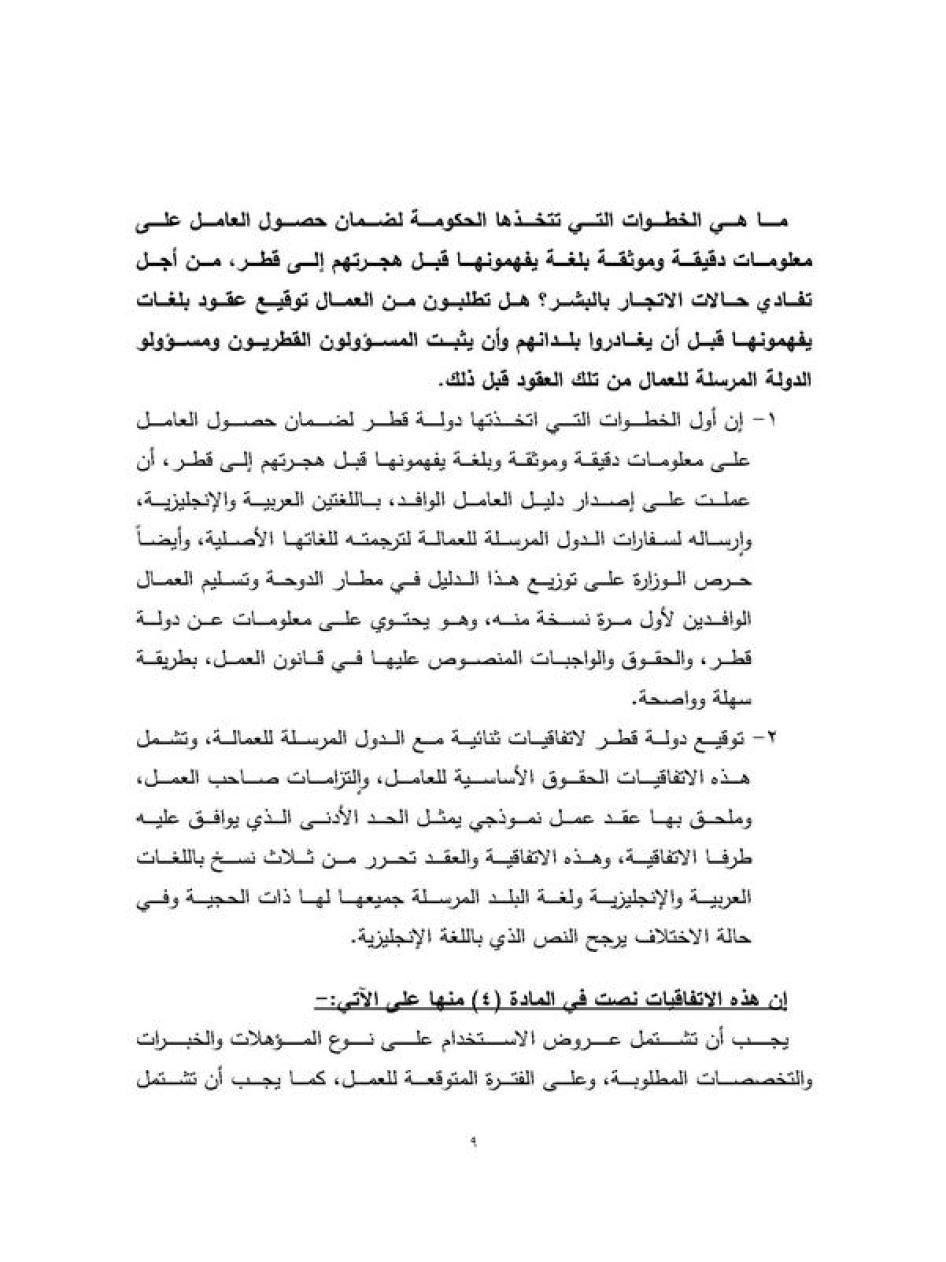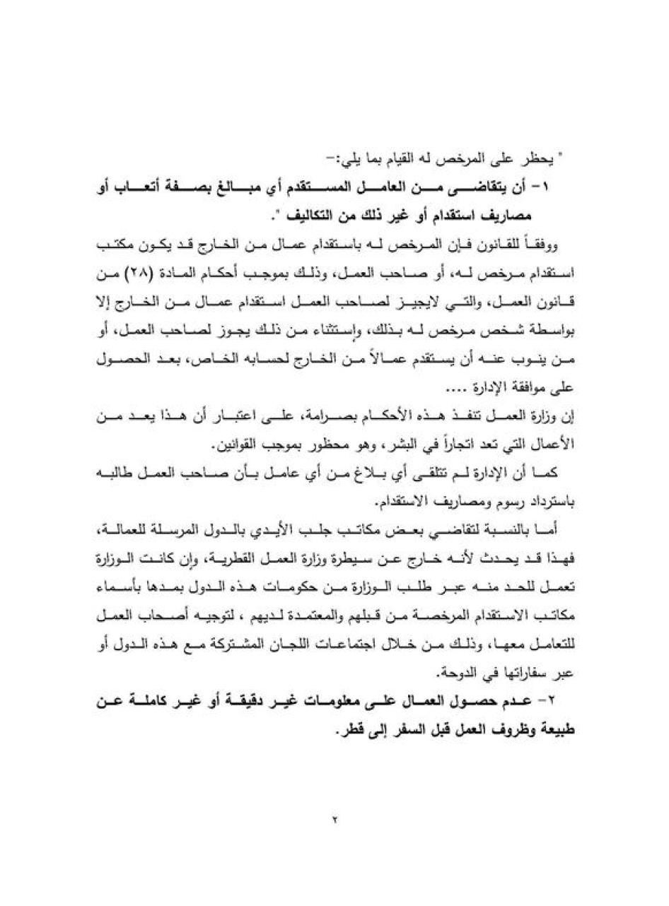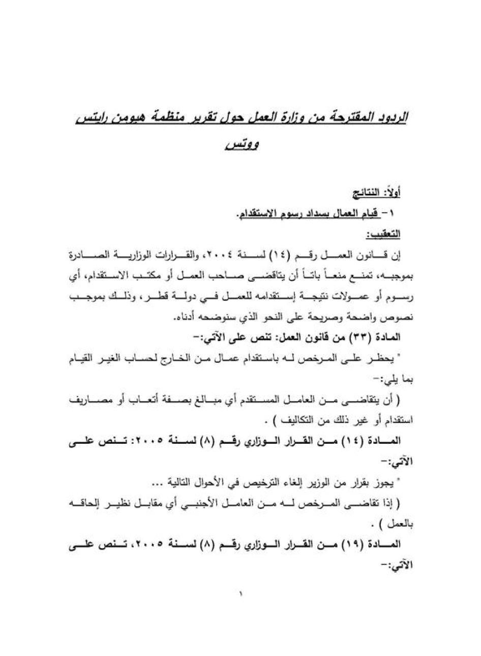 رداً على طلب بمعلومات إضافية تم إرساله إلى وزارات قطرية ومسؤولين قطريين، ذكرت وزارة العمل أن "قانون العمل (14 لسنة 2004) والقرارات الوزارية الصادرة بناء عليه، تحظر بكل حزم على أي صاحب عمل أو مكتب استقدام، تلقي أي رسوم أو عمولات على استقدام عمال إلى قطر. تفرض وزارة العمل هذه الأحكام بحزم، وهذه الأعمال تعتبر إتجاراً بالبشر، وهو محظور بموجب القانون. لم تتلق الإدارة شكوى من أي عامل طلب منه صاحب عمله أن يغطي بنفسه نفقات ورسوم استقدامه للعمل". [56] وأضافت الرسالة: "في حال تلقي الوزارة لشكوى بأن عاملاً سدد هذه الرسوم، تسحب التراخيص وتطالب المُخالف بتعويض العامل، سواء كان صاحب عمل أو مكتب استقدام للعمل". [57]