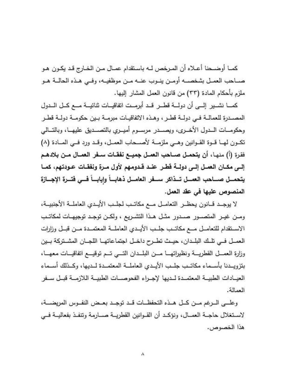 [251] بحث: أوضاع العمال غير المهرة في قطاع الإنشاءات في قطر، الصفحة 8.