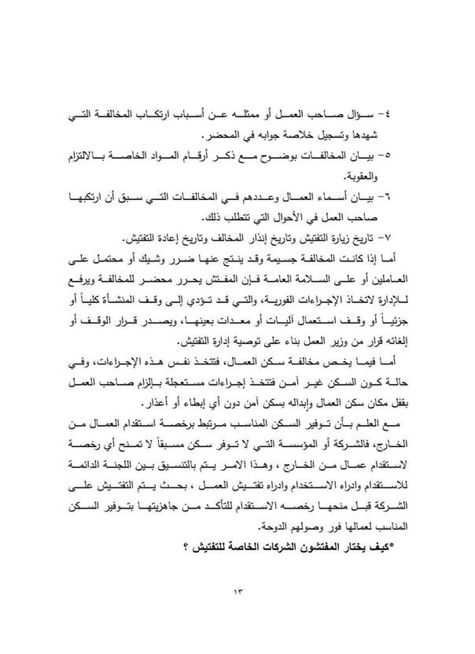 آليات المراقبة والتغطية لحقوق العمال غير الكافية تسمح باستمرار انتهاكات حقوق العمال وباستمرار قوانين الكفالة. توظف قطر 150 مفتش عمل لا أكثر لمراقبة أوضاع 1.2 مليون عامل. طبقاً لمسؤولي وزارة العمل، فليس من بين المفتشين من يتحدث لغات يستخدمها العمال في قطر، ولا تشمل عمليات التفتيش مقابلة العمال. قال مسؤولون لـ هيومن رايتس ووتش إنه بينما يراقب المفتشون أوضاع الإسكان ومشكلات تلقي الأجر وعقود العمل وساعات العمل، فهم يفعلون ذلك من خلال زيارات للمواقع ومراجعة لسجلات الشركات لا أكثر.