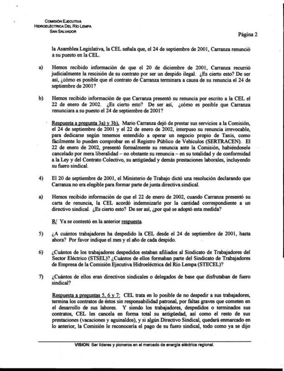 Tal como se alega en los casos de la Comisión Ejecutiva Hidroeléctrica del Río Lempa (CEL) y de Lido, S.A. de C.V.,––que se describen en el capítulo VII más abajo–– los empleadores despiden de manera rutinaria a aquellos trabajadores que se encuentran afiliados a organizaciones sindicales, pagando las pequeñas multas que corresponden de acuerdo con la ley vigente, como un mecanismo que les permite librarse de sindicalistas. Lido presuntamente despidió a treinta afiliados sindicales en mayo de 2002 y a otros veintidós entre el 14 de octubre y el 4 de noviembre del mismo año, pagándoles el monto indemnizatorio mínimo. Asimismo, entre el 24 de septiembre de 2001 y el18 de octubre de 2002 la CEL presuntamente despidió a cerca de treinta afiliados sindicales. Aunque la CEL adujo que algunos trabajadores renunciaron y que otros fuerondespedidos con causa, también les ofreció la indemnización mínima correspondiente en casos de despido ilegal.