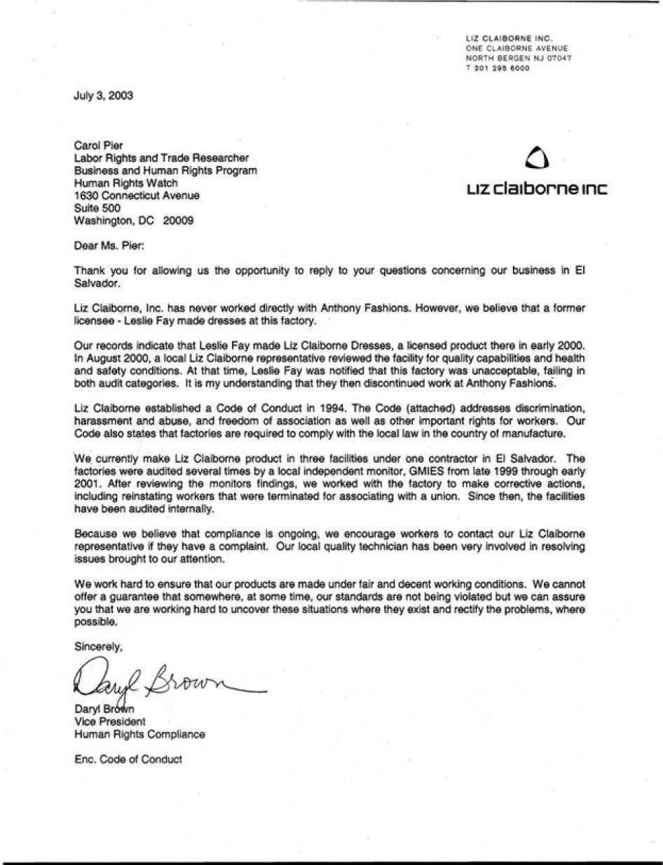 [422] Carta de Daryl Brown, vicepresidente de la sección conformidad con los derechos humanos, Liz Claiborne, Inc., dirigida a Human Rights Watch, 3 de julio de 2003.