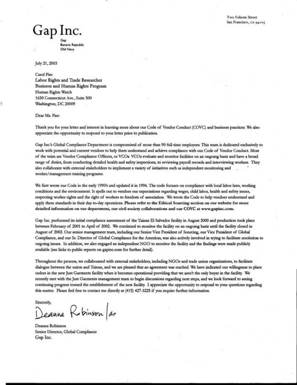 [431] Carta de Deanna Robinson, directora superior de cumplimiento global, The Gap, Inc., dirigida a Human Rights Watch, 21 de julio de 2003.