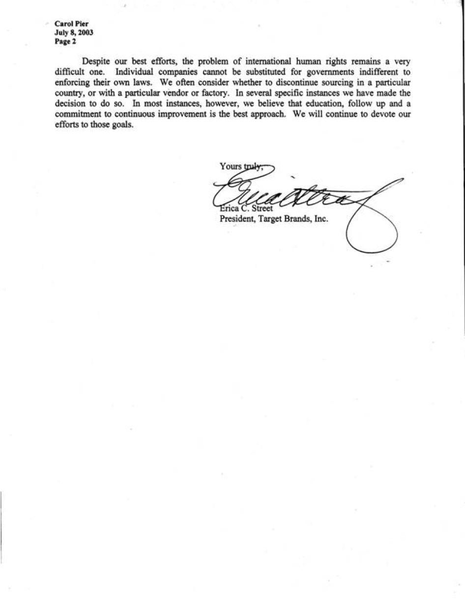 [430] Carta de Erica C. Street, presidente, Target Brands, Inc., dirigida a Human Rights Watch, 8 de julio de 2003.