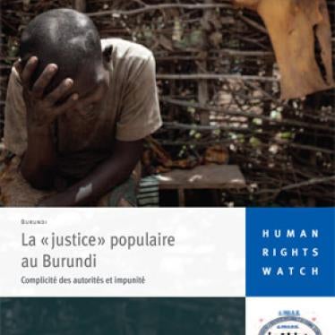 (Bujumbura, le 26 mars 2010) - Au Burundi, les attaques perpétrées par des foules contre de présumés malfaiteurs, souvent avec la complicité des autorités, ont conduit à au moins 75 meurtres en 2009, ont déclaré Human Rights Watch et l'Association pour la Protection des Droits Humains et des Personnes Détenues (APRODH) dans un rapport publié aujourd'hui. Le gouvernement burundais devrait mettre fin à l'implication des autorités dans des actes de « justice populaire » et traduire les responsables en justice, ont souligné Human Rights Watch et l'APRODH.