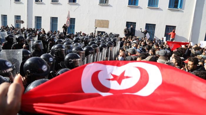 Des membres des forces de sécurité tunisiennes, a-t-il été rapporté, ont fait usage d’une violence excessive pour réprimer les manifestants dénonçant les difficultés économiques et réclamant la justice sociale ainsi que la fin de la répression policière, au cours de manifestations qui ont éclaté dans tout le pays le 15 janvier. D’après ces récits, des policiers ont frappé des manifestants, arrêté des centaines d’entre eux, dont de nombreux mineurs, tiré des gaz lacrymogènes de façon excessive pour disperser les manifestations, et agressé des journalistes. Haykel Rachdi, un jeune homme de 21 ans de Sbeïtla, est décédé le 18 janvier après avoir été blessé à la tête suite à une intervention policière au cours d’une manifestation.