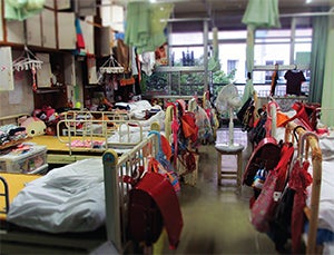 女子小学生用の寝室(岩手県内の児童養護施設)。女児は8人部屋での生活。個人の空間は唯一ベッドの上だけ。しかもそのプライバシーを保つのは、ベッドを仕切る薄いカーテン1枚だ。