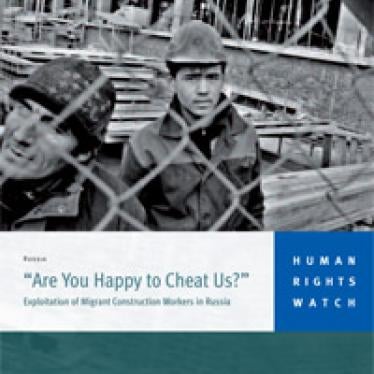 130ページの報告書「『私たちをだまして幸せですか?』:ロシアの建設現場で働く出稼ぎ労働者の搾取」は、賃金未払いや法律で定めれられた労働契約が締結されない状態が蔓延している実態や、ロシア全土の建設現場で出稼ぎ労働者たちが危険な労働条件で働かされている実態を報告している。同報告書は、本人の知らない間に仕事斡旋業者により強制労働現場に人身売買された労働者のケースも複数取り上げている。こうした仕事斡旋業者たちは、ロシアの建設業界での仕事を約束しながら、実際には、パスポートを取り上げて賃金なしで強制労働させる業者に出稼ぎ労働者たちを送り込んだ。なかには、監禁され暴行を受けた労働者たちもいる。
