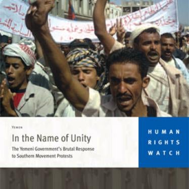 本報告書「統一の名の下の暴力:南部での抗議運動に対するイエメン政府の残虐な対応の実態」(73ページ)は、政府を批判する南部運動(Southern Movement)の支持者や、ジャーナリスト、研究者、その他の社会のリーダーに対する治安機関の攻撃を調査して明らかにした報告書。本報告書は、イエメン南部の都市アデン(Aden)やムカッラ(Mukalla)で行われた80回を超える被害者への聞き取り調査を基にして作成された。本報告書は、治安機関が、少なくとも6回、非武装のデモ参加者に対し、命の危険をもたらす有形力を行使したことを明らかにしている。過去1年の間 に、イエメン当局は、平和的な集会を行う権利を行使しただけの数千名の人びとを恣意的に逮捕し、政府の政策に批判的な中立的メディアの活動を停止させ、ジャーナリストや評論家を濡れ衣の罪の容疑で拘禁してきた。