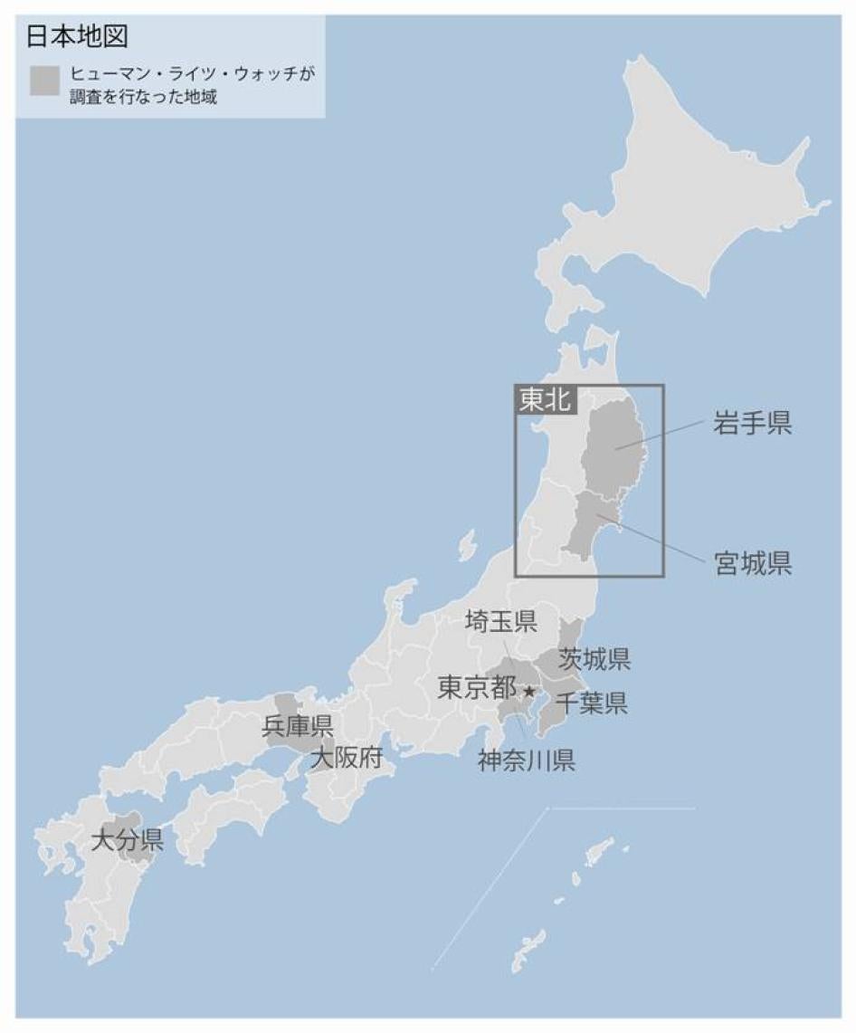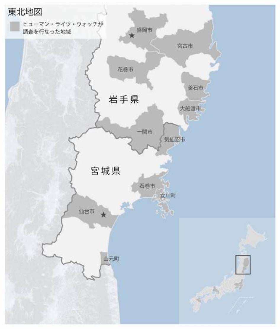 インタビューを行った202人のうち、61人が東北地方の方々である。ヒューマン・ライツ・ウォッチは2011年12月、2012年5月、6月、8月と4回現地を訪れた。東日本大震災で被災した市町村を訪ねたほか、震災孤児やその養育にあたる人びと、地元の地方公務員や民間団体代表者などにインタビューした。