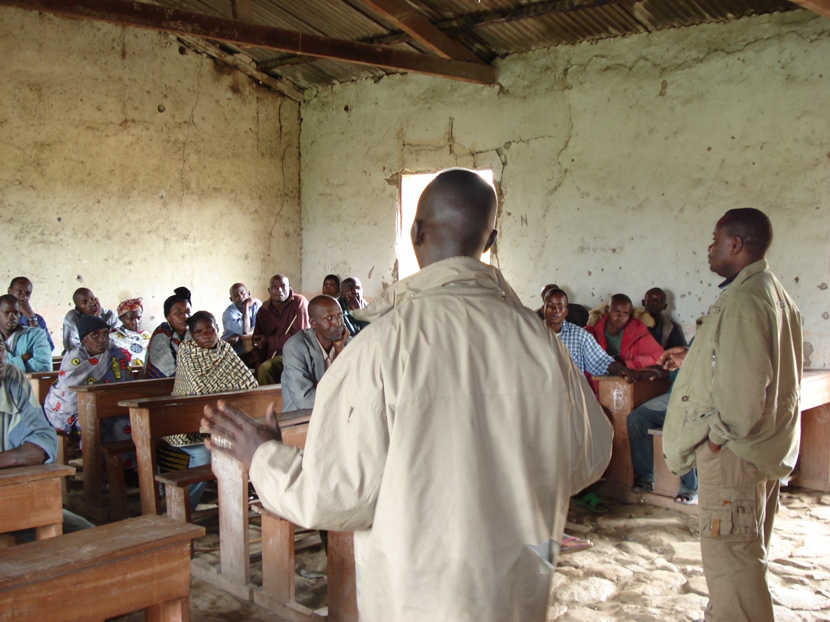 Le personnel de la Cour pénale internationale présente les activités de la Cour aux habitants d’un village de l’Ituri, région ravagée par la guerre à l’Est de la République Démocratique du Congo.