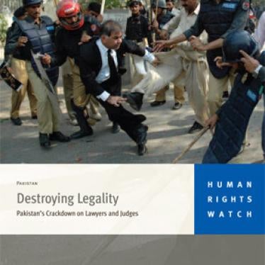 The 84-page report, “Destroying Legality: Pakistan’s Crackdown on Lawyers and Judges,” presents eyewitness accounts of police violence, arbitrary arrests, and mistreatment of detained lawyers across Pakistan since November 3, 2007. The report details police beatings of lawyers peacefully protesting government policies from within the grounds of Pakistan’s high courts. It is the most detailed account to date of the November crackdown, showing how Musharraf used the emergency as an excuse to disempower the judiciary, the legal profession and civil society in the name of fighting terrorism and Islamic extremists.