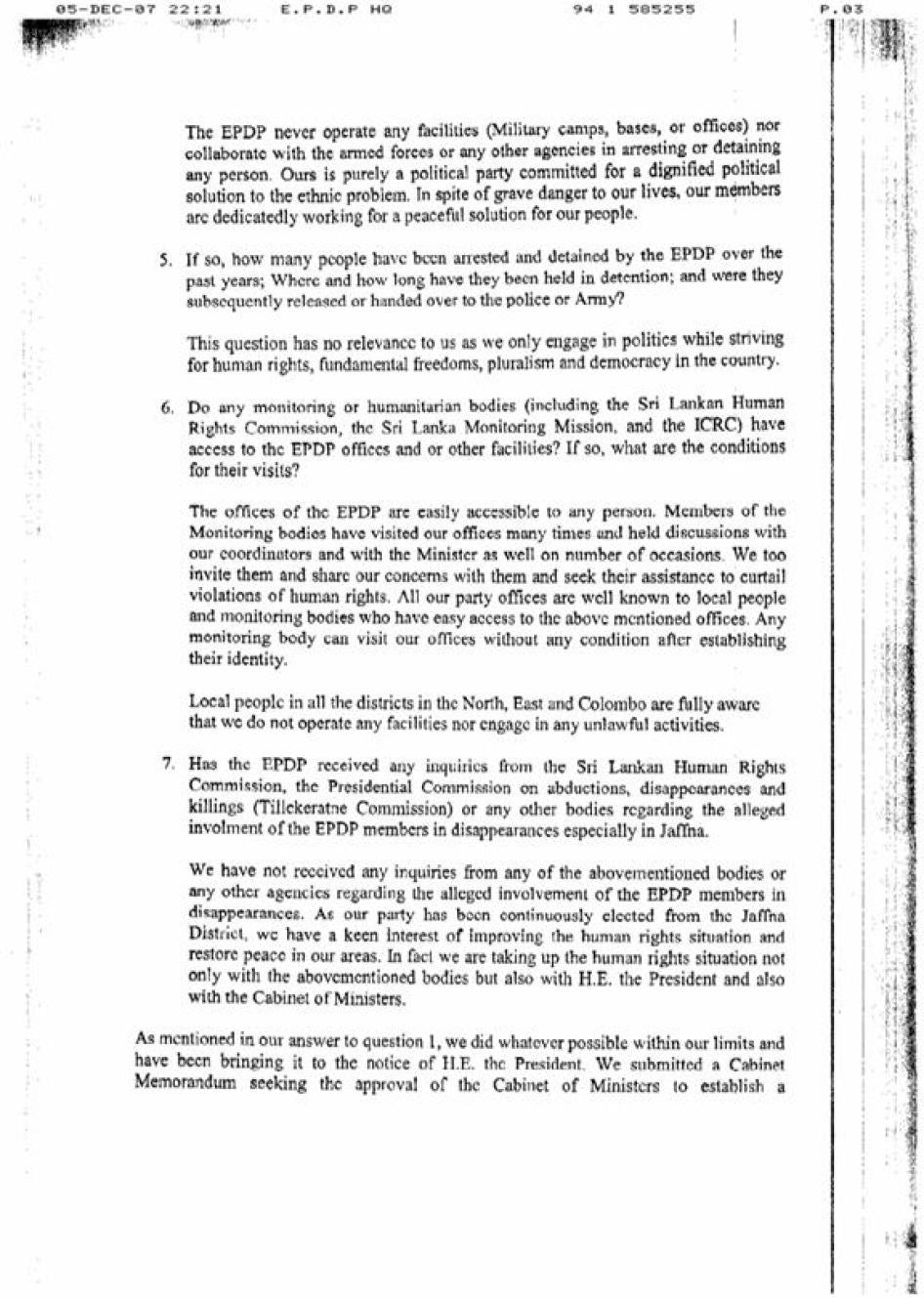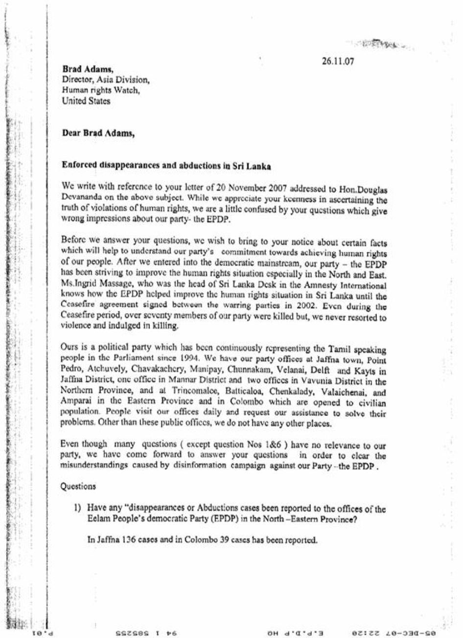 Human Rights Watch received responses from the Human Rights Commission of Sri Lanka and the Sri Lankan police. The EPDP also responded to the inquiry. Their responses are incorporated in the relevant sections of this report. Other officials mentioned above did not respond to Human Rights Watch inquiries. Human Rights Watch letters of inquiry and responses we have received are appended to this report (Appendix II).