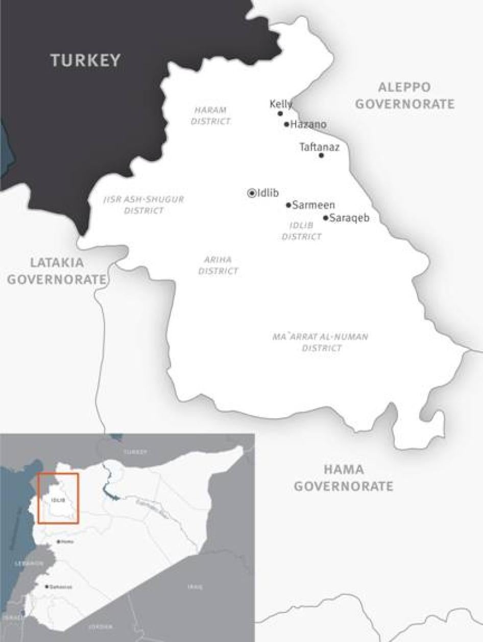 Human Rights Watch visited the towns of Sarmeen, Saraqeb, Taftanaz, Hazano, Kelly between April 25 to 29 and interviewed 65 victims and witnesses to the attacks. During visits to affected towns, Human Rights Watch also examined physical evidence such as destroyed and burned buildings, remnants of ammunition, and traces of bullets and shells.