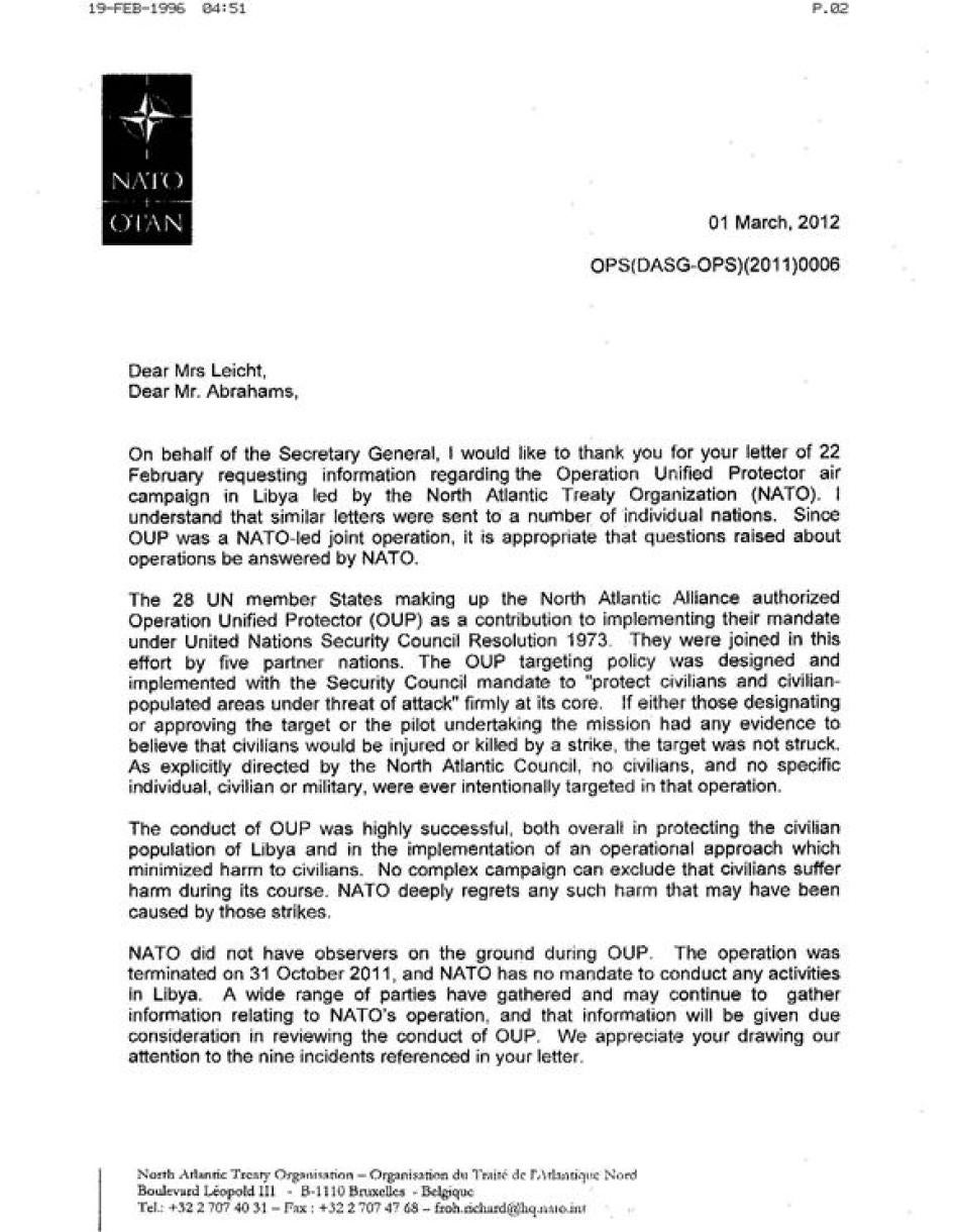 [53] Letter to Philippe Kirsch from NATO legal advisor Peter Olson, January 23, 2012, Report of the International Commission of Inquiry on Libya, Annex II.