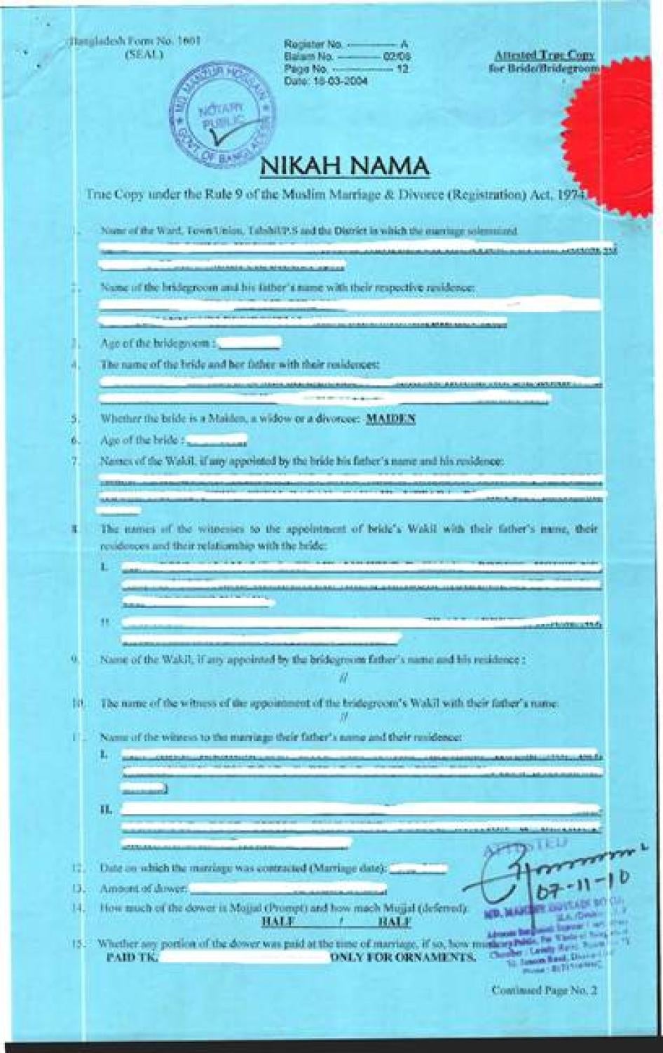 A marriage contract in Muslim law. The Bangladesh government has a standard format for such contracts. |
