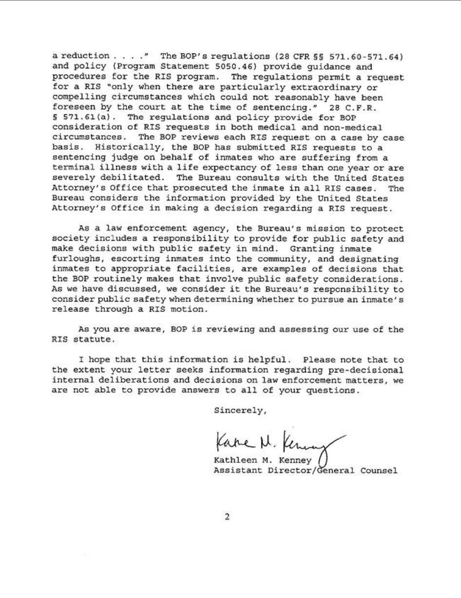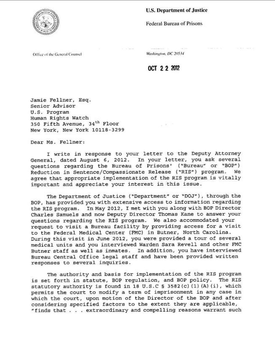 [138] Letter from Kathleen M. Kenney, Assistant Director and General Counsel, Bureau of Prisons, to Human Rights Watch, October 22, 2012. See also Bureau of Prisons, “Legal Resource Guide to the Federal Bureau of Prisons 2008,” November 25, 2008, http://www.bop.gov/news/PDFs/legal_guide.pdf (accessed November 2, 2012) (“Being mindful of its mission to protect society, the BOP utilizes [compassionate release] sparingly. Historically, motions for Reduction in Sentence … have been filed only on behalf of prisoners suffering from terminal medical conditions, or who are severely and permanently mentally or physically debilitated. Additional facts that are carefully considered include, but are not limited to, the nature of the crime committed, the length of the prisoner’s sentence, the amount of time served, and the prisoner’s ability to continue criminal activity.”).