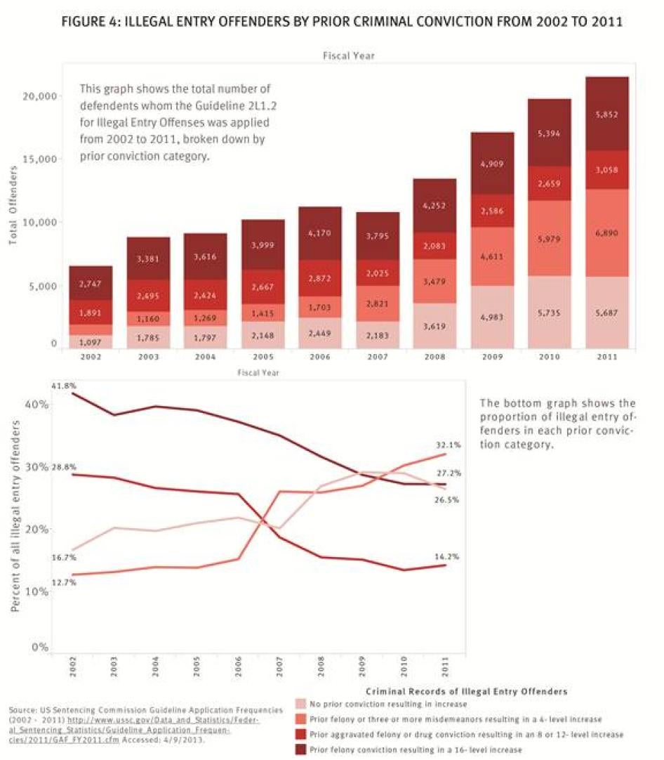 Even if one assumes that prior criminal records can be a useful predictor of future dangerousness, the data show a significant shift in who is being sentenced under the sentencing guideline for illegal entry offenses.