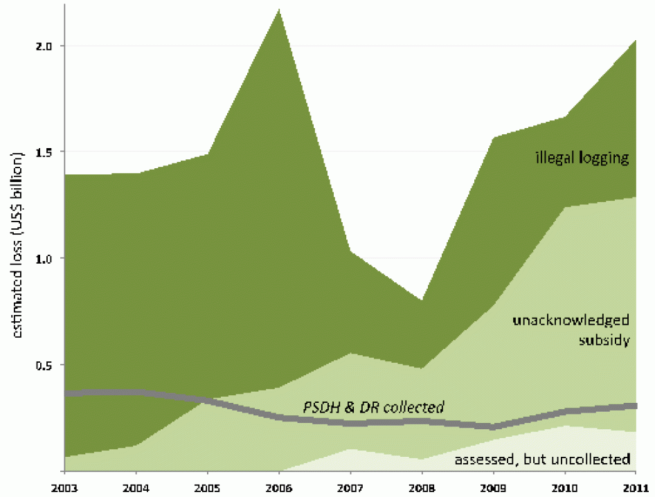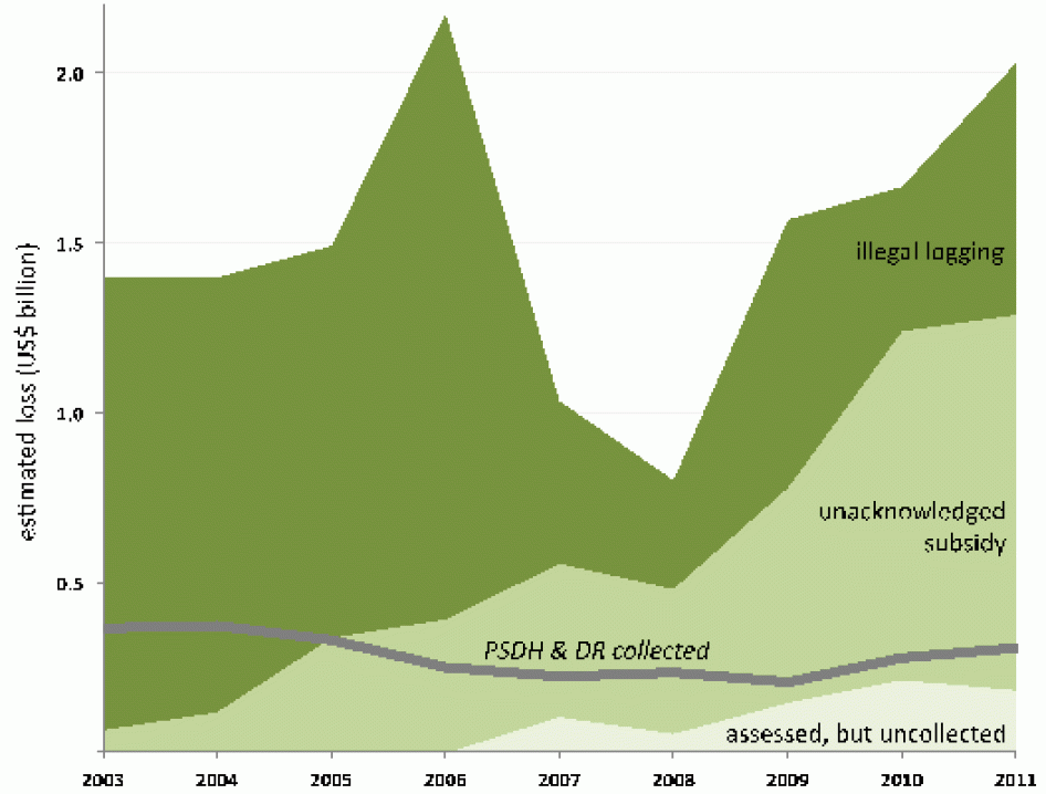 Not only are the losses staggering in their magnitude, they are stunning in comparison to the low level of forestry fees actually collected from the extraction of the nation’s public forest assets. For 2011, for example, the Ministry of Forestry reported collecting only 62 percent of the PSDH/DR fees we calculate should have been assessed based on the reported timber production.[6]