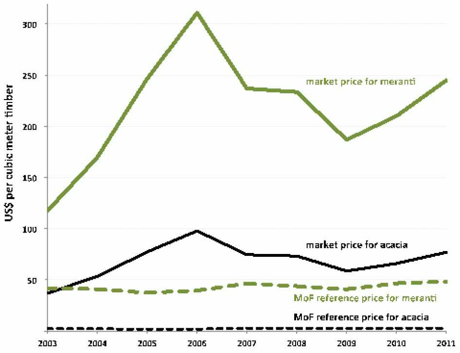 [205] Because there is not a reliable source of data for the price of acacia, we use the 2012 reference price for acacia given by MOF ($77/m3) and back-calculated the change over time, assuming it followed the same trend as for meranti. While the price of timber does vary between regions, the $16 DR fee is based on the ‘average’ per cubic meter DR charge for 2007-2009 reported in the MoF’s Table 1 in the Policy Brief No. 5. Ministry of Forestry, “Evaluation of Natural Forest Timber PSDH Rates” (“Evaluasi Tarif PSDH Kayu Hutan Alam,”), Policy Brief, vol. 5, no. 5, 2011.