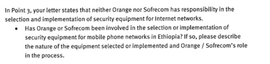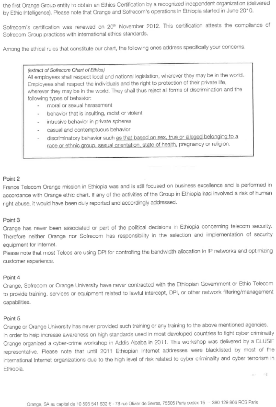 Letter from Ms. Brigitte Dumont, Orange to Human Rights Watch