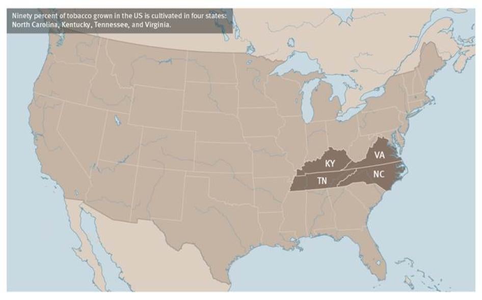 Tobacco is grown in at least 10 US states, but North Carolina, Kentucky, Virginia, and Tennessee account for almost 90 percent of domestic tobacco production. Roughly 50 percent of all US-produced tobacco is grown in North Carolina, 25 percent in Kentucky, and 7 percent in each of Virginia and Tennessee.[4] In 2007, the last year for which there is relevant data, there were 8,113 tobacco farms in Kentucky, 2,622 farms in North Carolina, 1,610 farms in Tennessee, and 895 farms in Virginia.[5]