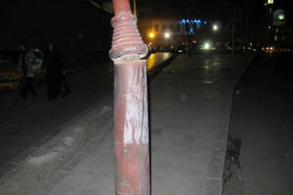 On August 28, 2012, a car bomb exploded in front of the cemetery entrance in the Tishreen/al-Turbi neighborhood during a funeral, according to two witnesses.[26] No publicly available information indicates that any group claimed responsibility for the bombing. Bassel, a witness to the bombing, told Human Rights Watch that earlier in the day two civilians had been killed in mortar strikes on the city and were being buried at about 2:30 p.m. when a car across the street from the cemetery entrance exploded;