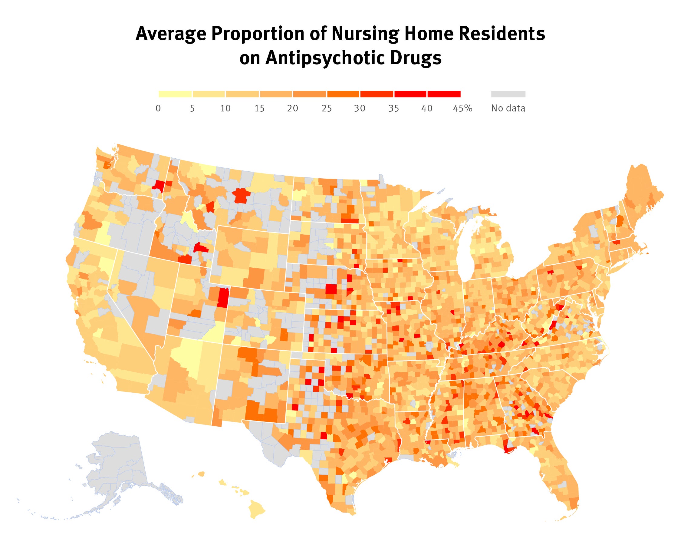 This topic was chosen because of the paradox that misuse of the drugs has been well-documented for decades, prohibited by law, and yet persists as a pervasive, serious problem. The amount of publicly available data on nursing homes and antipsychotic drugs specifically made it feasible to conduct the research. The project was also chosen to attempt to amplify the voice and highlight the circumstances of some of the most isolated individuals: not only by living in nursing homes or having dementia, but also by being under the influence of the psychotropic medication.