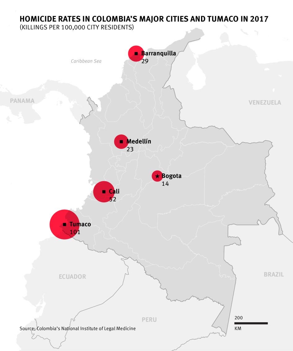In early 2018, the Colombian government launched a powerful military and police operation to curb abuses by armed groups, deploying thousands of security officers to Tumaco and nine neighboring municipalities in Nariño Province. The operation helped arrest scores of people but data through September 2018 shows that serious abuses in Tumaco are continuing at comparable rates or have actually increased. As noted above, Tumaco’s already high homicide rate shot up further during the first nine months of 2018.