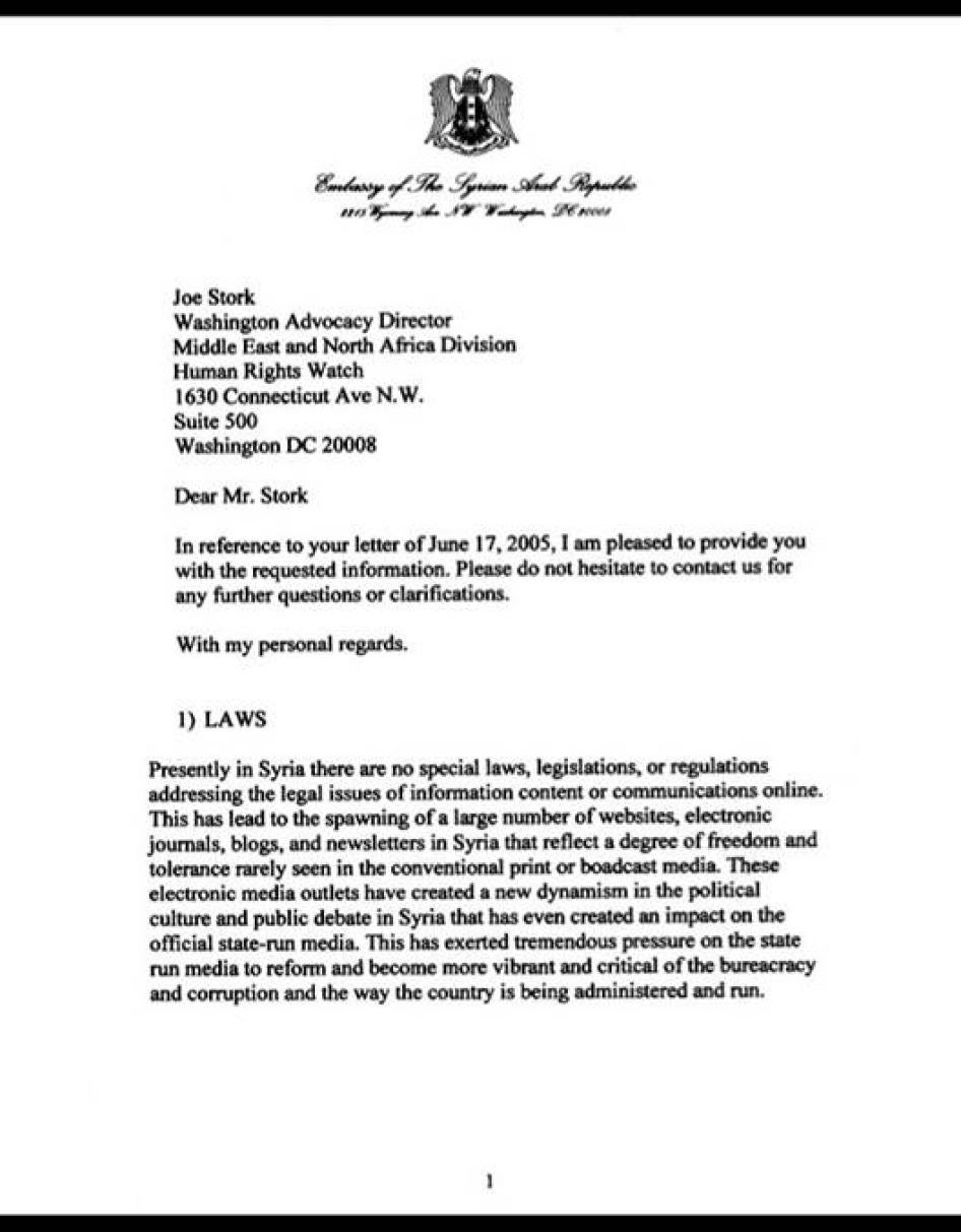 [322] Confidential emails from Syrian bloggers and computer programmers to Human Rights Watch, September – October 2005.