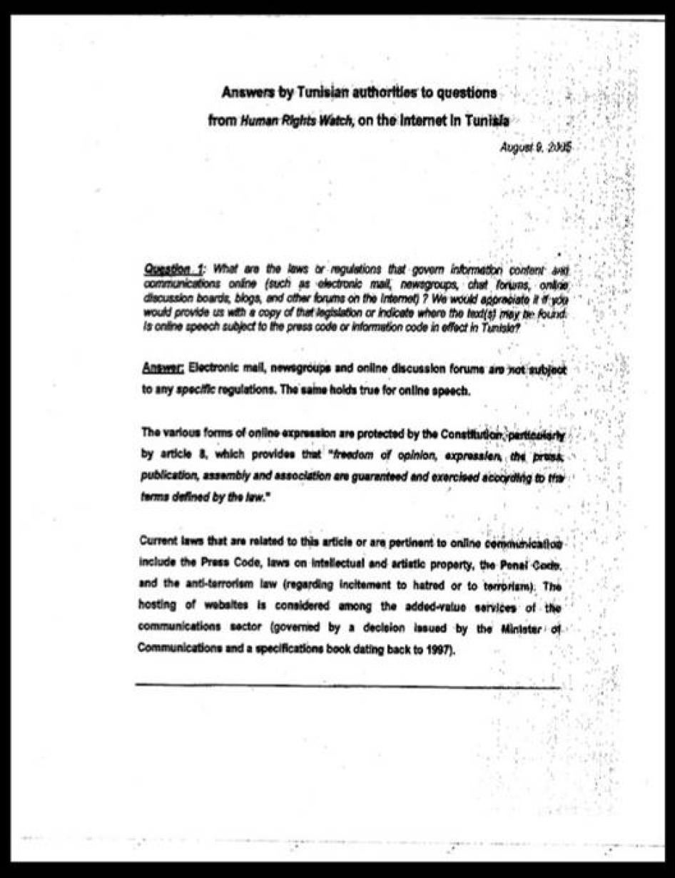 [359] Letter from Chargé d'Affairs Dridi to Human Rights Watch. Tunisia, in a letter sent in 2000 to the U.N. Commission on Human Rights, denied that the Press Law applies to the Internet. See letter dated May 26, 2000, from the Permanent Representative of Tunisia to the United Nations Office at Geneva, addressed to the United Nations High Commissioner for Human Rights, July 14, 2000, E/CN.4/2001/4, attaching the reply of the Tunisian Government to the report of the Special Rapporteur: "In referring to Internet access, it is regrettable that the Special Rapporteur misinterpreted certain legal texts. He states, without any basis in legal precedent or administrative regulations, that the regime of responsibility laid down by the Press Code is applicable to the Internet." http://www.unhchr.ch/Huridocda/Huridoca.nsf/0/f70f1154a1429481c12569ac004f22ee/$FILE/G0014311.doc, accessed October 4, 2005.